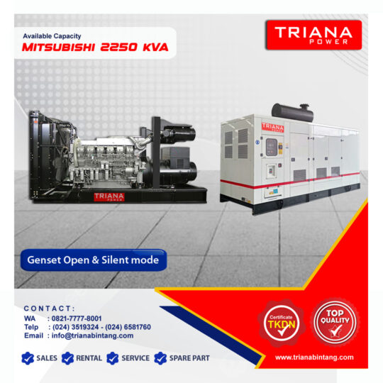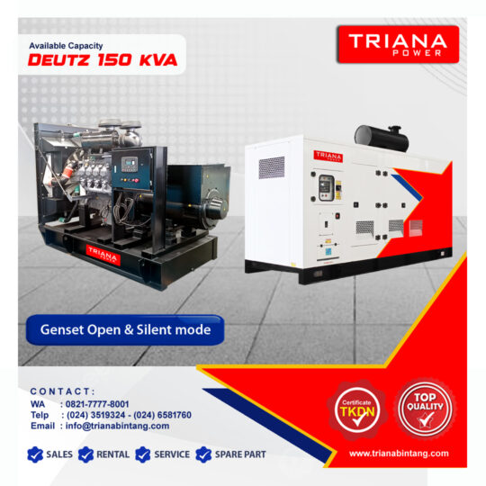 Triana Bintang Genset tersedia sangat lengkap dengan kapasitas mulai dari 20 – 1500 kVA. Triana Bintang Genset menjual jenis Silent Type dan Open Type seperti Genset Deutz, Genset Perkins, Genset Cummins, Genset Mitsubishi, Genset Stargen, Genset Skylark dengan Generator Stamford, Generator Leroy Somer, Generator Prime, Generator Stargen dan Generator Skylark. Genset kami siap ditest 100%.